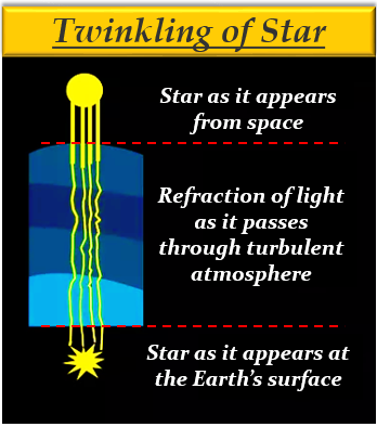 當大氣層將更多的星光折射到我們這裡時,恆星看起來很明亮;而當它折射的星光較少時,恆星看起來就會變暗。這樣,由於折射,到達我們眼睛的星光不斷增加和減少,因此恆星在夜間看起來會閃爍。