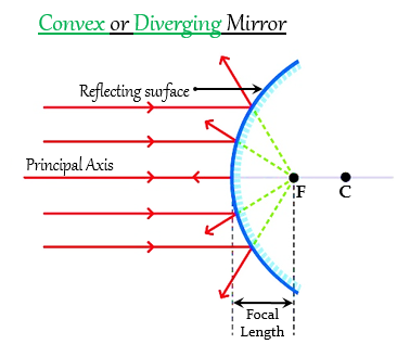 凸面鏡,也稱為發散鏡,因為它中間向外彎曲,當光線照射到鏡子的反射面上時,會使光線發散。它有一個虛焦點 (F),位於鏡子的後面。