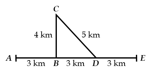 總位移 = AB + BD + DE = 3 + 3 + 3 = 9 公里