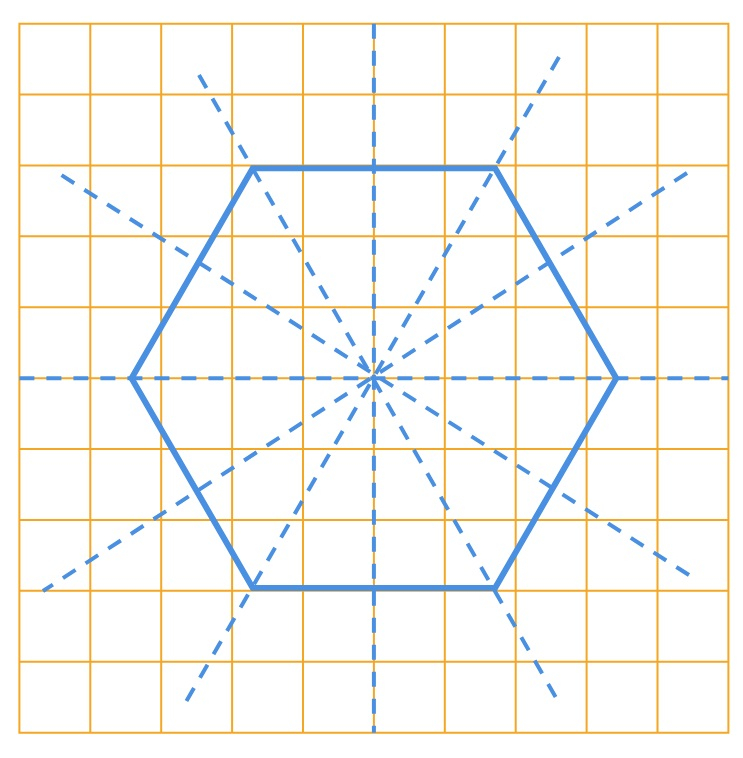 (e) 可以如下繪製一個具有六條對稱線的六邊形