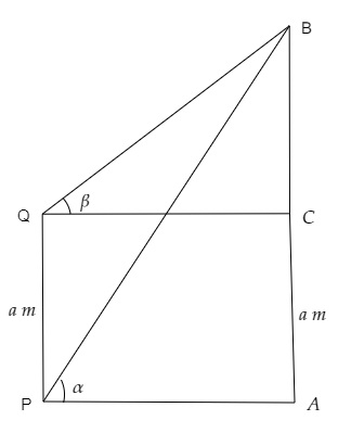 PQ是一根已知高度為a的柱子,AB是一座位於一定距離處的塔。α和β分別是P點和Q點測得塔頂B的仰角。