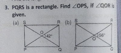 $PQRS$ 是一個矩形。如果已知 $\angle QOR$,求 $\angle OPS$。$( a).\ 42^o$ $( b).\ 56^o$.