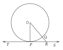 畫一條線$OR$,與圓相交於$Q$點,並與切線$TS$相交於$R$點。