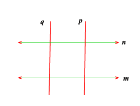 兩條直線 m 和 n 平行,另兩條直線 p 和 q 分別垂直於 m 和 n。