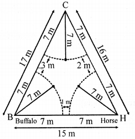 一個三角形草地的三條邊長分別為\( 15 \mathrm{~m}、16 \mathrm{~m} \)和\( 17 \mathrm{~m} \)。在草地的三個角上,分別用長度為\( 7 \mathrm{~m} \)的繩子繫著一頭牛、一頭水牛和一匹馬,讓它們在草地上吃草。求三隻動物無法吃到的草地的面積。