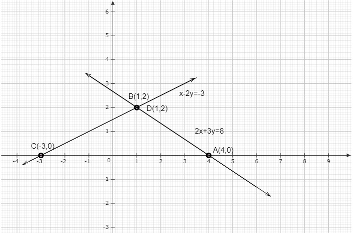 因此,給定方程組的解是 $x=1$ 和 $y=2$。方程 $2x+3y=8$ 和 $x-2y=-3$ 所表示的直線分別與X軸相交於 $(4,0)$ 和 $(-3,0)$。