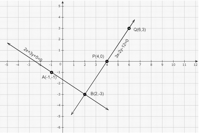 直線 AB 表示方程 $2x+3y+5=0$,直線 PQ 表示方程 $3x-2y-12=0$。