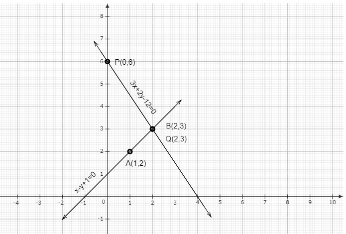 直線 AB 表示方程 $x-y+1=0$,直線 PQ 表示方程 $3x+2y-12=0$。