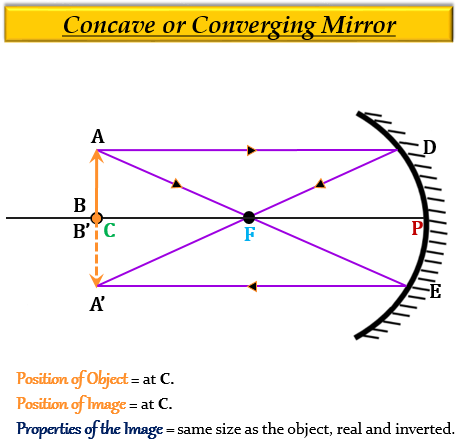(c) 為了使凹面鏡成像與物體大小相同,物體必須放置在鏡子的曲率中心 $(C)$ 上。