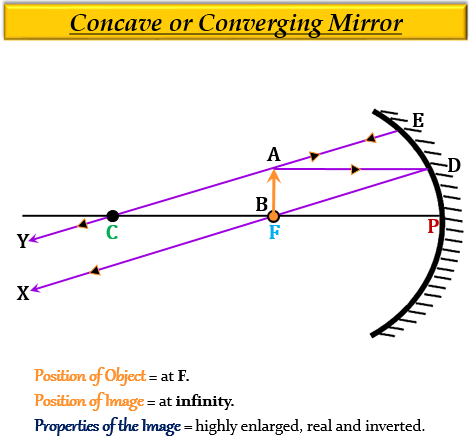(b) 為了使凹面鏡成像在無限遠處,物體必須放置在鏡子的焦點 $(F)$ 上。
