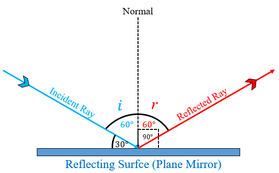 現在,根據反射定律,入射角 (∠i) = 反射角 (∠r) = 60°