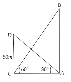 $\mathrm{CD}=50 \mathrm{~m}, \angle \mathrm{BCA}=60^{\circ}, \angle \mathrm{DAC}=30^{\circ}$