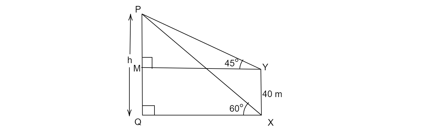 $tan45^{o} =\frac{QM}{MY} =1=\frac{h-40}{PX} \ \ \ \ \ \ \ \ ( \because \ MY\ =\ PX)$
