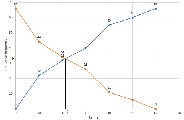 我們需要使用“大於”型和“小於”型累積頻數曲線計算中位降雨量。