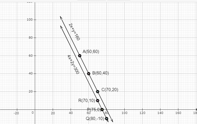 直線 AC 表示方程 $2x+y-160=0$,直線 PR 表示方程 $4x+2y-300=0$。