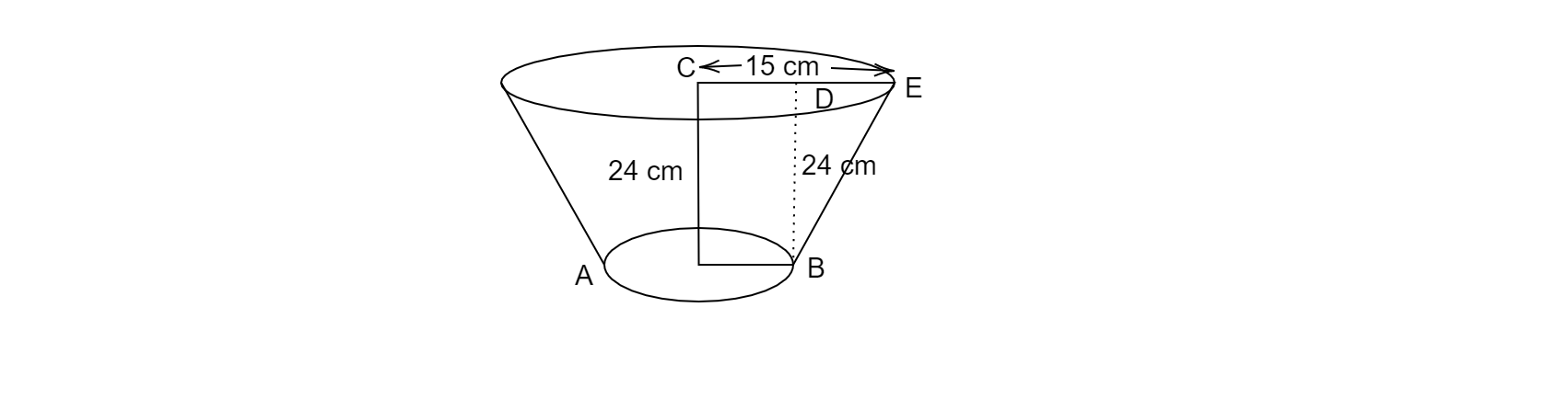 一個桶形如圓臺,底端和頂端的直徑分別為\( 10 \mathrm{~cm} \)和\( 30 \mathrm{~cm} \)。如果它的高度為\( 24 \mathrm{~cm} \)。(i) 求製作該桶所需的金屬板面積。(ii) 為什麼我們應該避免使用普通塑膠製作水桶?