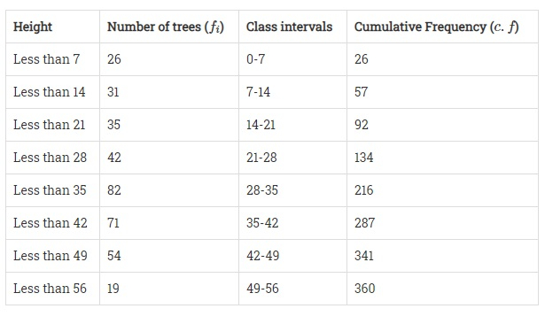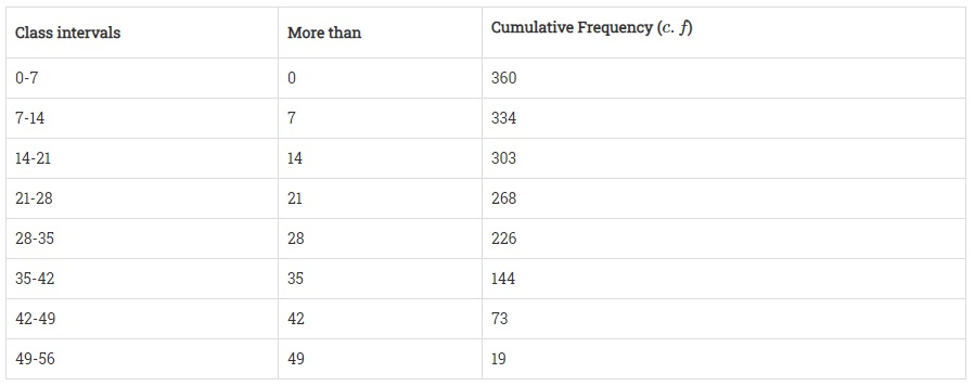 在圖表上繪製點(0, 360), (7, 334), (14, 303), (21, 268), (28, 226), (35, 144), (42, 73) 和 (49, 19),並用自由手繪線連線它們,得到如下所示的累積頻數曲線。