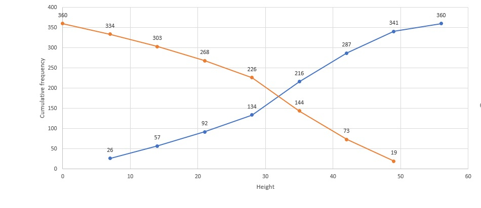 我們必須繪製“小於”累積頻數曲線和“大於”累積頻數曲線。