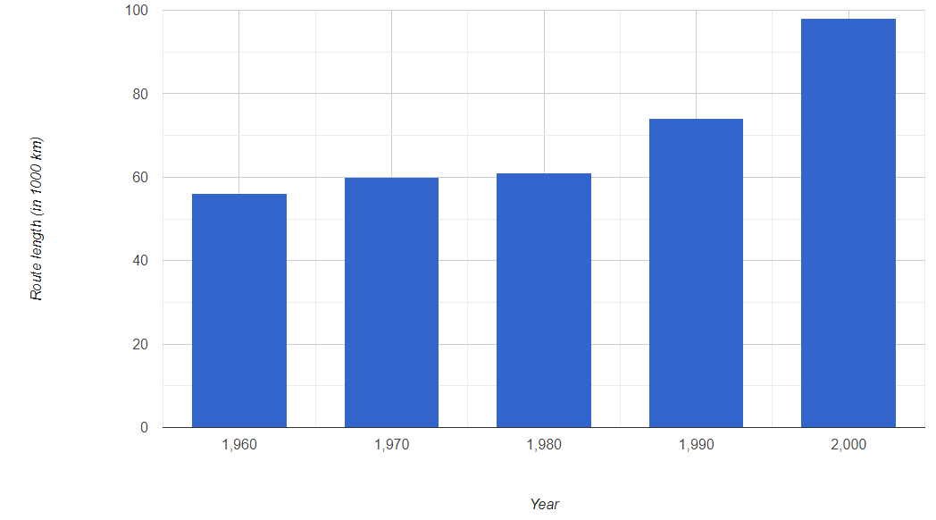 下表列出了印度鐵路部分年份的線路長度(單位:千公里)