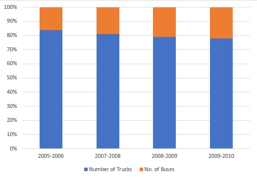 給定的表格顯示了最近百萬輛單位的客車和卡車數量。