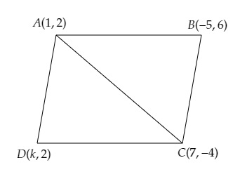 設 $A(1, 2), B(-5, 6), C(7, -4)$ 和 $D(k, -2)$ 為四邊形 $ABCD$ 的頂點。
