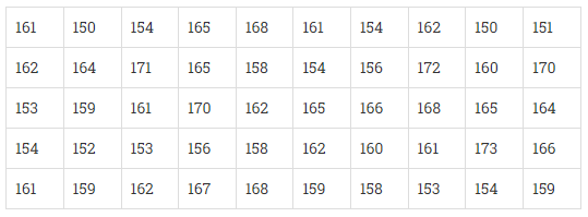 (i) 用分組頻數分佈表表示以上資料,取組距為\( 160-165,165-170 \)等。