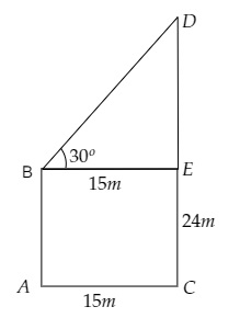 $BE=AC= 15\ m$ 且 $AB=EC=h$ 以及 $DE = 24-h\ m$