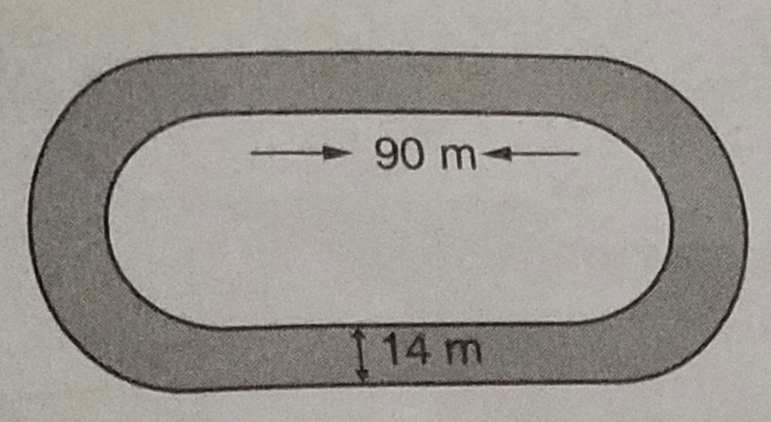 一條跑道的內周長為 \( 400 \mathrm{~m} \)。每段直線的長度為 \( 90 \mathrm{~m} \),兩端為半圓形。如果跑道處處寬 14 \( m \),求跑道的面積。另外,求外跑道的長度。