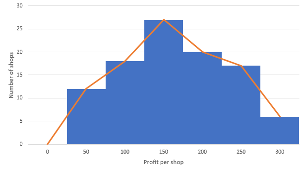 100家商店的月利潤(單位:盧比)分佈如下:每家商店的利潤:0-50 50-100 100-150 150-200 200-250 250-300 商店數量:12 18 27 20 17 6 繪製其頻率多邊形。