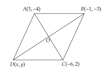 設第四個頂點為 D(x,y),對角線 AC 和 BD 相交於點 O。