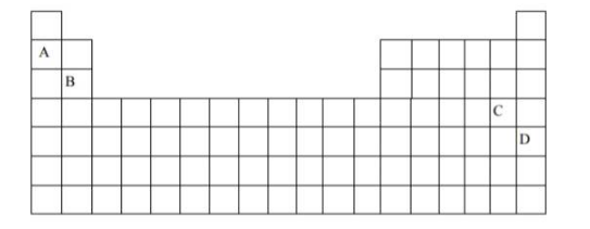 下圖顯示了四個元素 A、B、C 和 D 在現代元素週期表中的位置