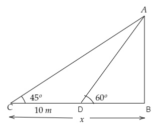 $\mathrm{CD}=10 \mathrm{~m}, \angle \mathrm{ACB}=45^{\circ}, \angle \mathrm{ADB}=60^{\circ}$