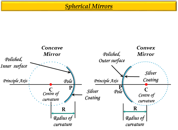 如果一個球面鏡的內表面是閃亮的或拋光的,則它是一個凹面鏡,而如果一個球面鏡的外表面是閃亮的或拋光的,則它是一個凸面鏡。