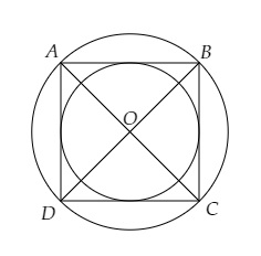 設正方形為$ABCD$,每條邊長為$10\ cm$,$r_1$為外接圓的半徑,$r_2$為內切圓的半徑。