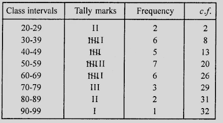 我們需要將資料製成表格,並使用 70-79 作為其中一個組距,將其表示為累積頻數表。