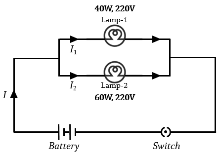 有兩盞燈,一盞額定功率為 40 W,電壓為 220 V;另一盞額定功率為 60 W,電壓為 220 V。這兩盞燈並聯連線到 220 V 的電源上- 畫出電路圖以顯示連線方式。