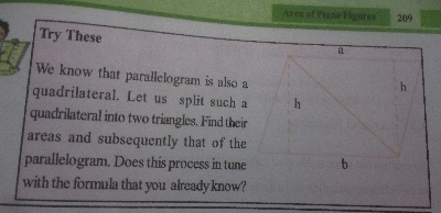 我們知道平行四邊形也是一個四邊形。讓我們將這樣一個四邊形分成兩個三角形。求出它們的面積,然後求出平行四邊形的面積。這個過程與你已知的公式一致嗎?