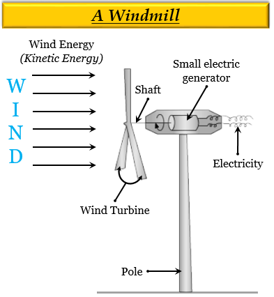 風是空氣的流動,是一種能量來源。它擁有動能。風具有動能,當快速移動的風撞擊風力渦輪機時,它開始旋轉,因此風的動能轉化為機械能。此外,風力渦輪機透過軸連線到發電機,因此它也旋轉並驅動發電機產生電力。最後,機械能轉化為電能。