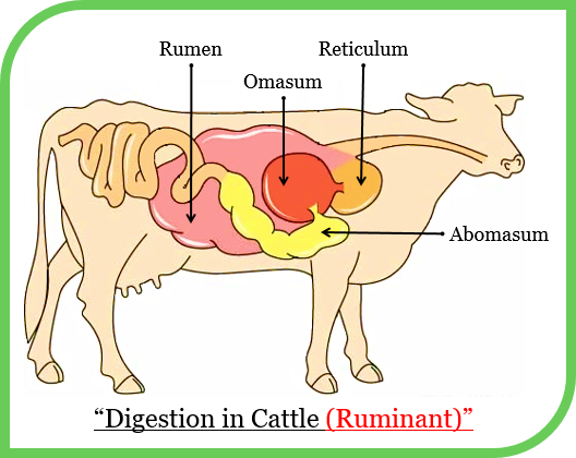 反芻動物不會完全咀嚼它們吃的草或植被。部分咀嚼的草進入大的瘤胃中儲存,並分解成“反芻” 的球狀物。當動物吃完後休息時,它們開始“反芻”。然後反芻物再次被吞嚥,進入接下來的三個胃室——網胃、瓣胃和真胃(皺胃)。