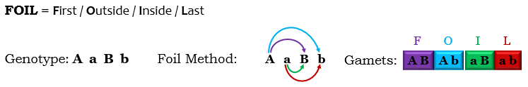 排除二倍體雜交中可能出現的配子組合的最簡單方法是使用FOIL 方法。FOIL = 首項/外項/內項/末項。