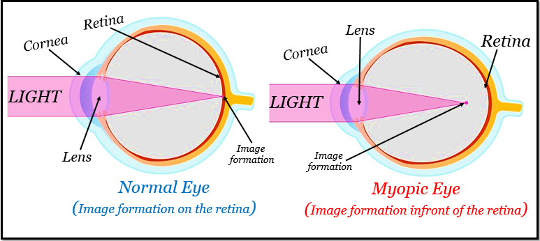 這種缺陷發生在眼睛具有過強的聚焦能力時,可能是由於眼睛過長,導致光線聚焦在視網膜前而不是直接在視網膜上。或者,角膜比平時彎曲得更多,使眼睛變得過強。