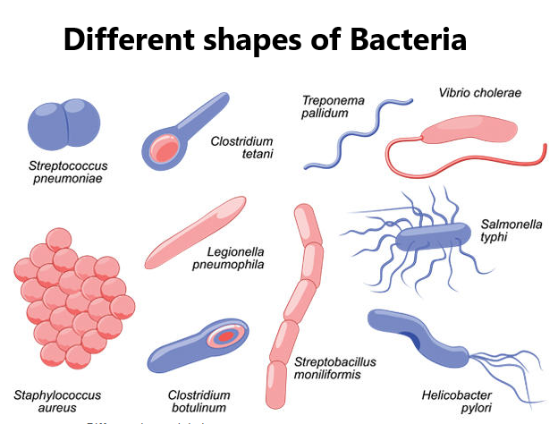 基本形狀,細菌可分為五類:球形(球菌)、杆形(桿菌)、螺旋形(螺旋菌)、逗號形(弧菌)或螺旋形(螺旋體)。它們可以以單細胞、成對、鏈狀或簇狀存在。