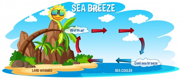 海風是在白天吹向陸地的風,因為陸地比海洋升溫快。陸地上的空氣密度較小(即較暖)並上升,所以密度較大(較冷)的海面上空冷空氣流動來填補暖空氣的位置,從而形成海風。