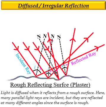 2. 漫反射/不規則反射 - 這是非鏡面反射的光線反射。在這種型別的反射中,光線撞擊到表面粗糙的不規則物體(如白色大理石、灰泥和風吹動水面)上,會向各個方向反射和散射。這裡,入射光線以許多角度反射,而不是像鏡面反射那樣只有一個角度。因此,這種型別的反射會產生模糊的影像。
