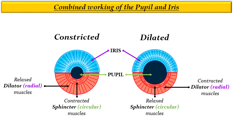 在明亮的條件下, 瞳孔收縮或縮小以限制進入眼睛的光線,這樣過多的光線就不會導致眩光和眼睛不適,甚至不會損害眼睛的晶狀體和視網膜。