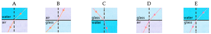 在圖 E 中,光從水(密度較小的介質)傳播到玻璃(密度較大的介質),因此它應該朝向法線彎曲,並且該圖遵循了這一原理。因此,它是正確的。
