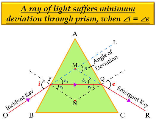 當光線透過稜鏡發生最小偏轉,且稜鏡內部的折射光線平行於其底邊時,入射角(∠i)和出射角(∠e)將相等,即 ∠i = ∠e。