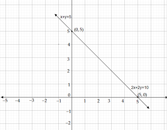 在圖上畫出點 $( 0,\ 5)$ 和 $( 5,\ 0)$,並連線它們得到方程