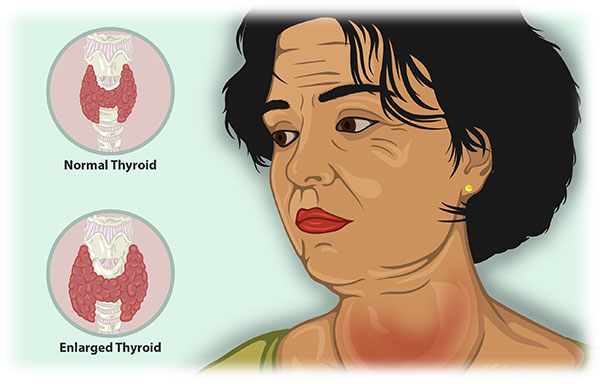 由於甲狀腺不能獲得足夠的碘,因此會逐漸腫大形成甲狀腺腫,這是因為它在盡力滿足對甲狀腺激素產生的需求。在世界範圍內,碘缺乏是導致甲狀腺腫大甲狀腺腫的原因中最常見的原因。