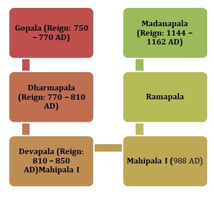 德瓦帕拉 − 他是達拉馬帕拉的兒子,也是王位的繼承人。他將王國的領土擴充套件到阿薩姆邦和奧里薩邦。他還擊敗了一位拉什特拉庫塔統治者。